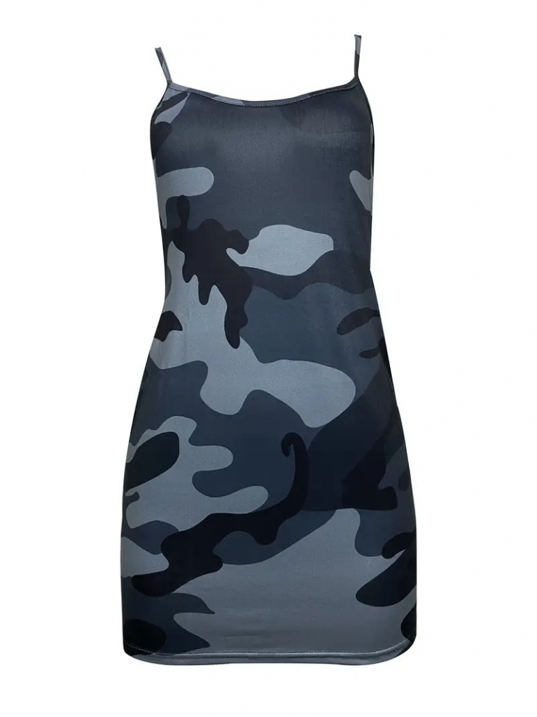 Kadın Kolsuz Ip Askılı Kamuflaj Baskılı Viskon Elbise